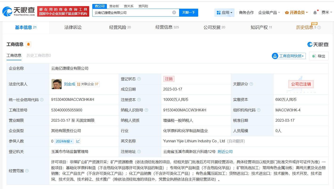 【大河财立方消息】10月21日消息,天眼查App显示,近日,云南亿捷锂业有限公司登记状态由存续变更为注销。此前,该公司已发布简易注销公告。