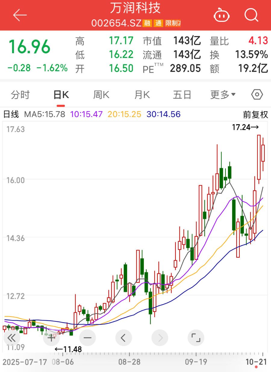 10月21日,万润科技(002654)(002654.SZ)低开震荡,截至9时58分报16.85元/股,跌幅2.26%。此前两个交易日(10月17日、20日),其股价累计涨幅超17%,其中20日更是强势涨停。