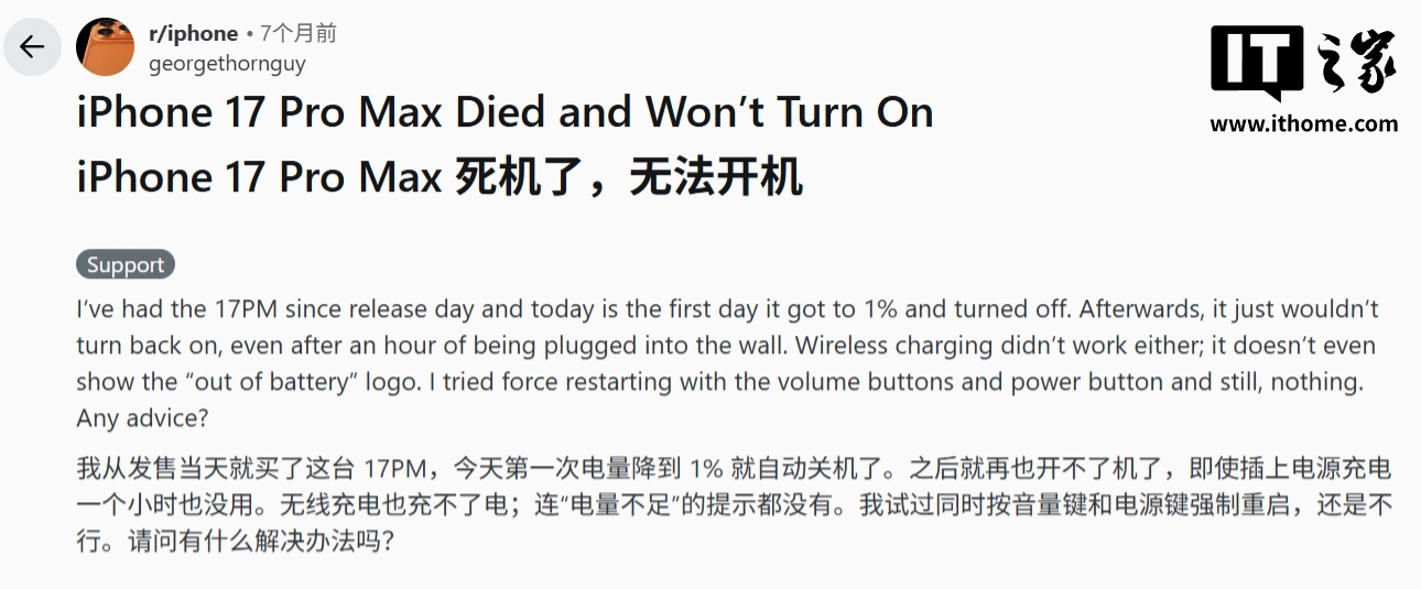 IT之家 4 月 28 日消息,科技媒体 Notebook Check 昨日(4 月 27 日)发布博文,报道称多名 iPhone 17、iPhone 17 Pro、iPhone 17 Pro Max 和 iPhone Air 用户在 Reddit 与 iFixit 论坛反馈,手机电量完全耗尽后,插入 USB-C 线后无法开机和充电。