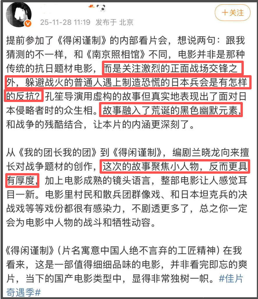 从业内人士的反馈中可以了解到,《得闲谨制》讲述的故事与抗日有关,但是却另辟蹊径,关注激烈的正面战场交锋之外,躲避战火的普通人遇上制造恐慌的日本兵会有怎样的反抗。编剧兰晓龙本就擅长对战争题材的创作,这次的故事聚焦小人物,反而更具有厚度。有厚度的故事加上孔笙导演成熟的镜头语言,影片让人有耳目一新的感觉。