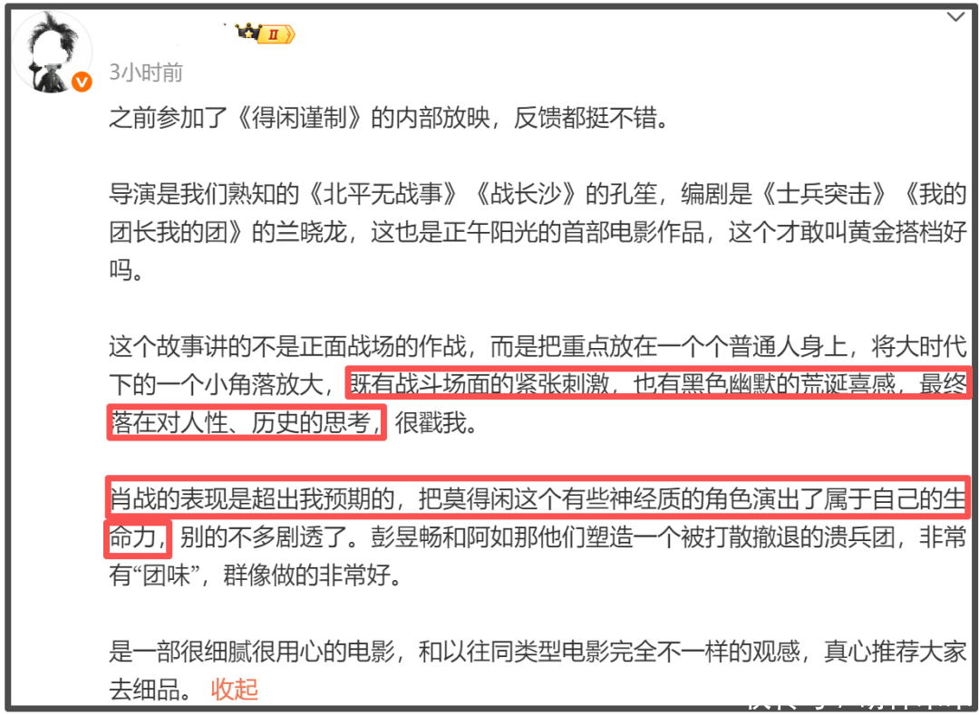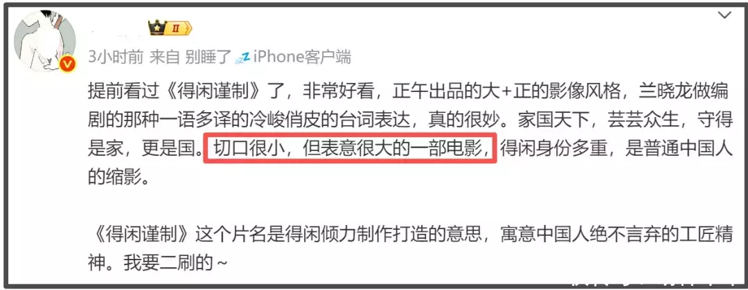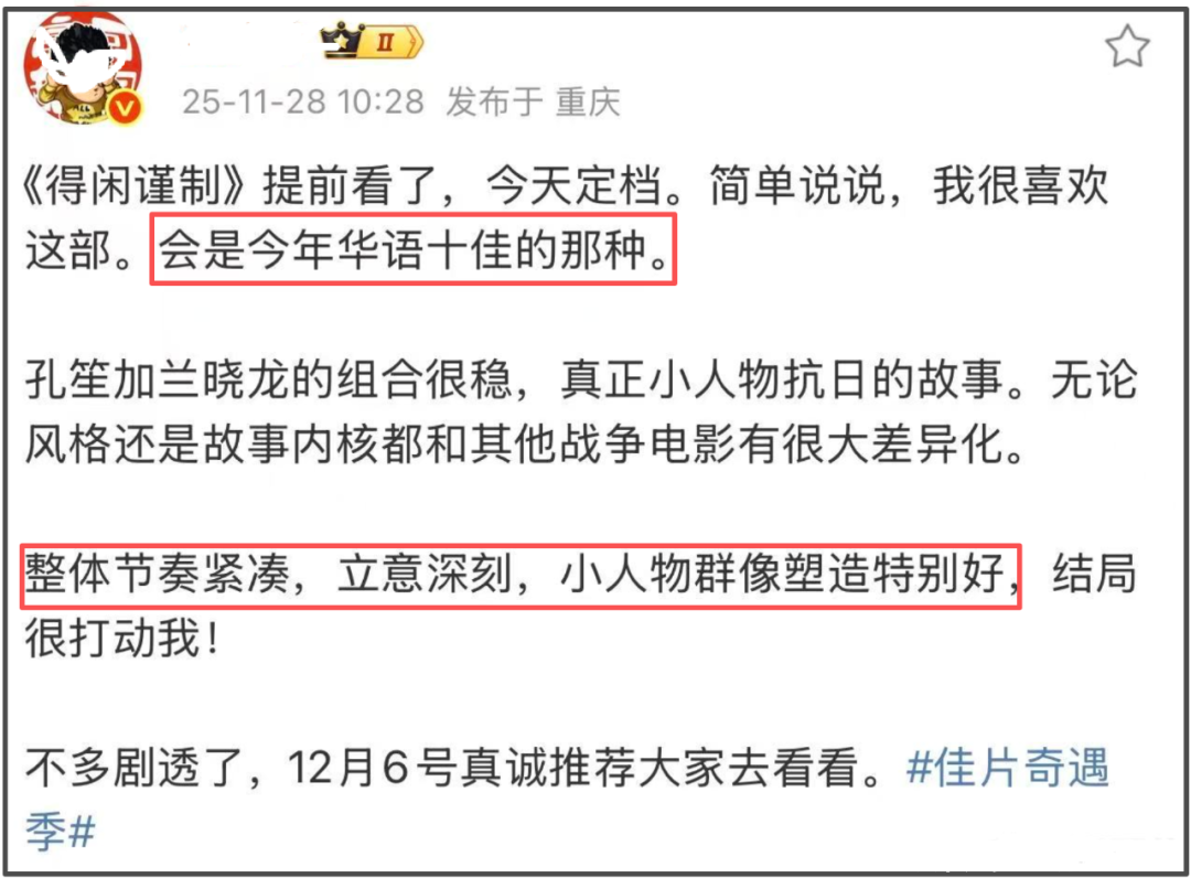 影片虽然还没有上映,但是却已经有小波口碑出炉。在影片定档之前,已经有业内人士受邀参加内部看片会,提前看到了影片。如今,影片官宣定档,受邀业内人士也纷纷发布影评,从大家反馈的评价中不难看出业内人士对《得闲谨制》一片的认可和看好。