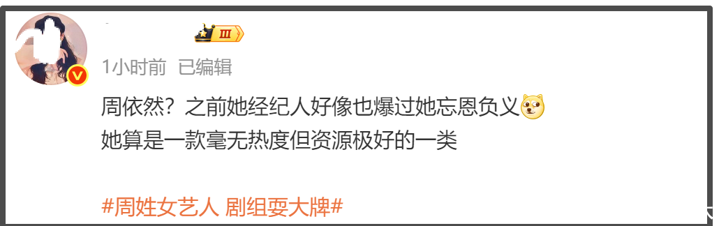 根据爆料人透露的过两天马上要上的电视剧、和童姓女演员合作等信息,网友将该周姓女演员锁定为周依然,网友扒出她和胡先煦合作的《即刻上场》的确在爆料不久之后播出。另外,在《有你的时光里》,周依然和童瑶饰演姐妹,有激烈争吵动手的画面。
